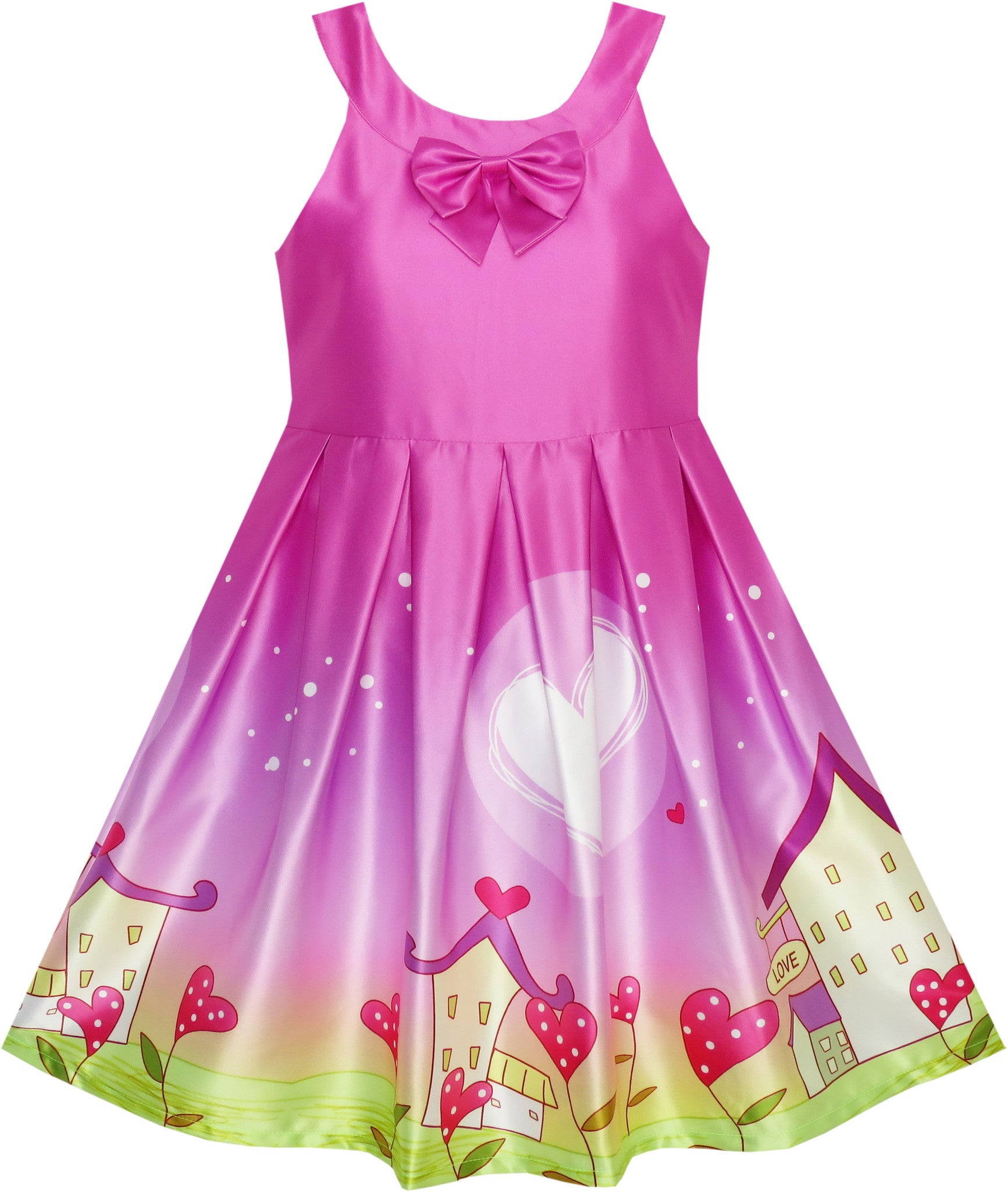 Unique design fit and flare dress with cartoon house and love hot print and bow tie. Halter neck design and pleated hem. Violet red color. This shinning purple dress is elegant. Perfect for any special occasion, wedding ,first communion dress and party dress. Following size means age ranges for girls, they are for general guidance only. For most accurate fit, we recommend checking detailed measurement before purchase.