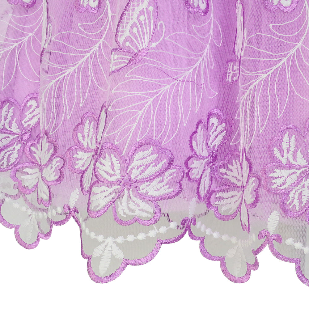 Gorgeous girls sleeveless halter dress. Abundant butterfly embroidery makes this gauzy tulle dress a garden party dream. We have purple and turquoise color for your choice. Perfect for any special occasion, wedding, ball dress and birthday party dress. Following size means age ranges for girls, they are for general guidance only. For most accurate fit, we recommend checking detailed measurement before purchase.