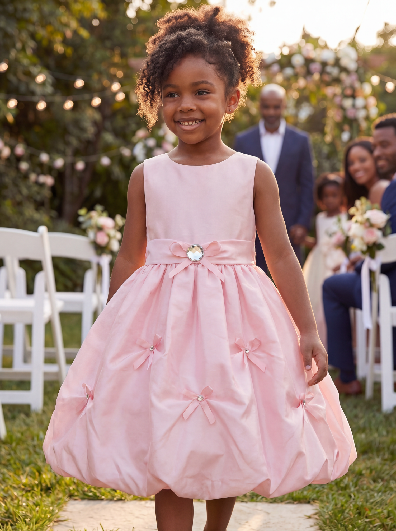 Elegant, sweet, and full of princess charm—this Sunny Fashion Girls Pink Satin Bow Party Dress is made for unforgettable moments. Crafted from glossy satin fabric, it features a structured bodice and a voluminous skirt that creates a classic, twirl-worthy silhouette. The waist is adorned with a beautiful bow and sparkling detail, while delicate mini bow accents across the skirt add an extra touch of sophistication. Perfect for dressing up and celebrating in style, this dress blends timeless elegance with playful charm.