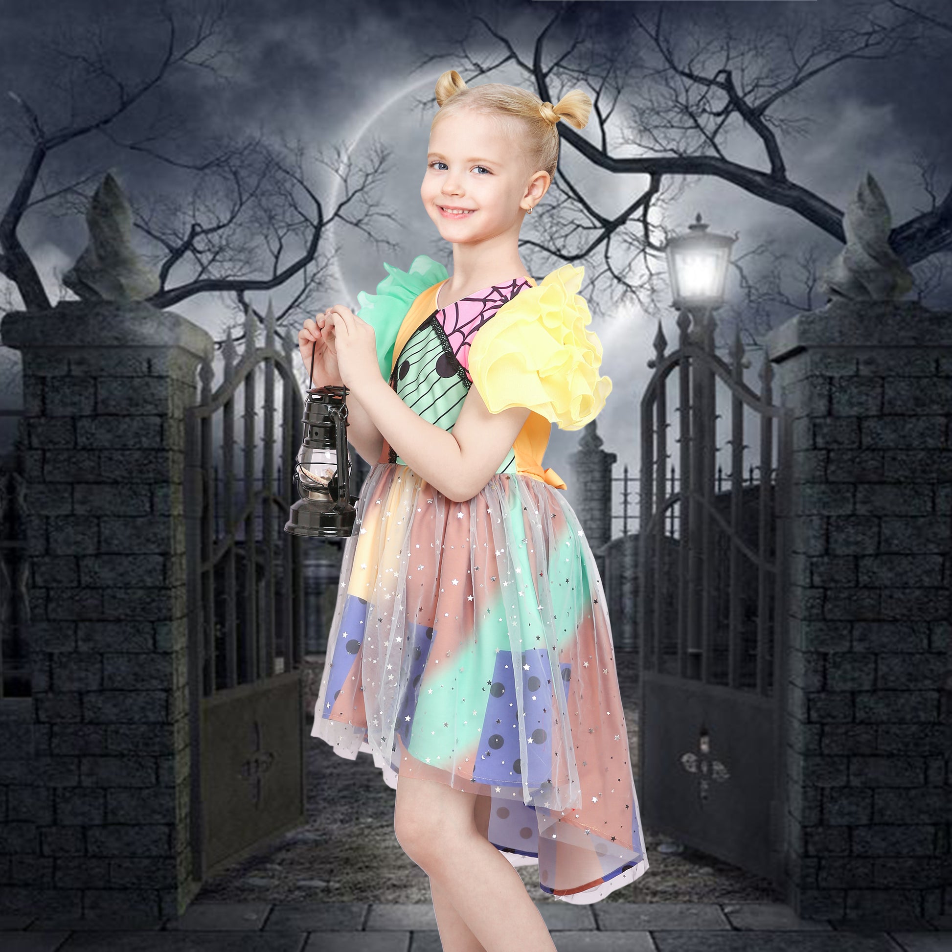 Girls Dress Halloween Square Collar Layer Skirt Puff Short Sleeve Size 4-14 Years