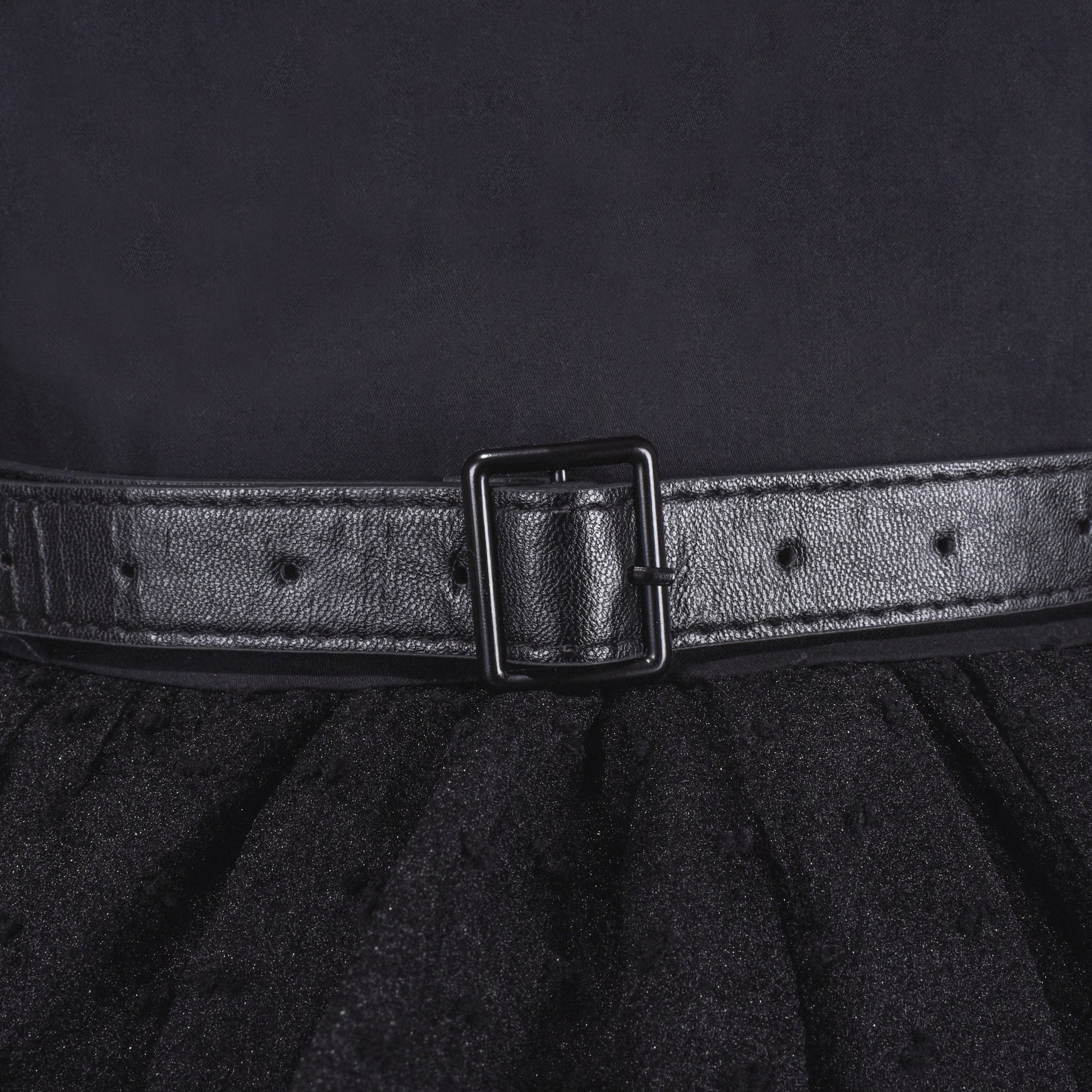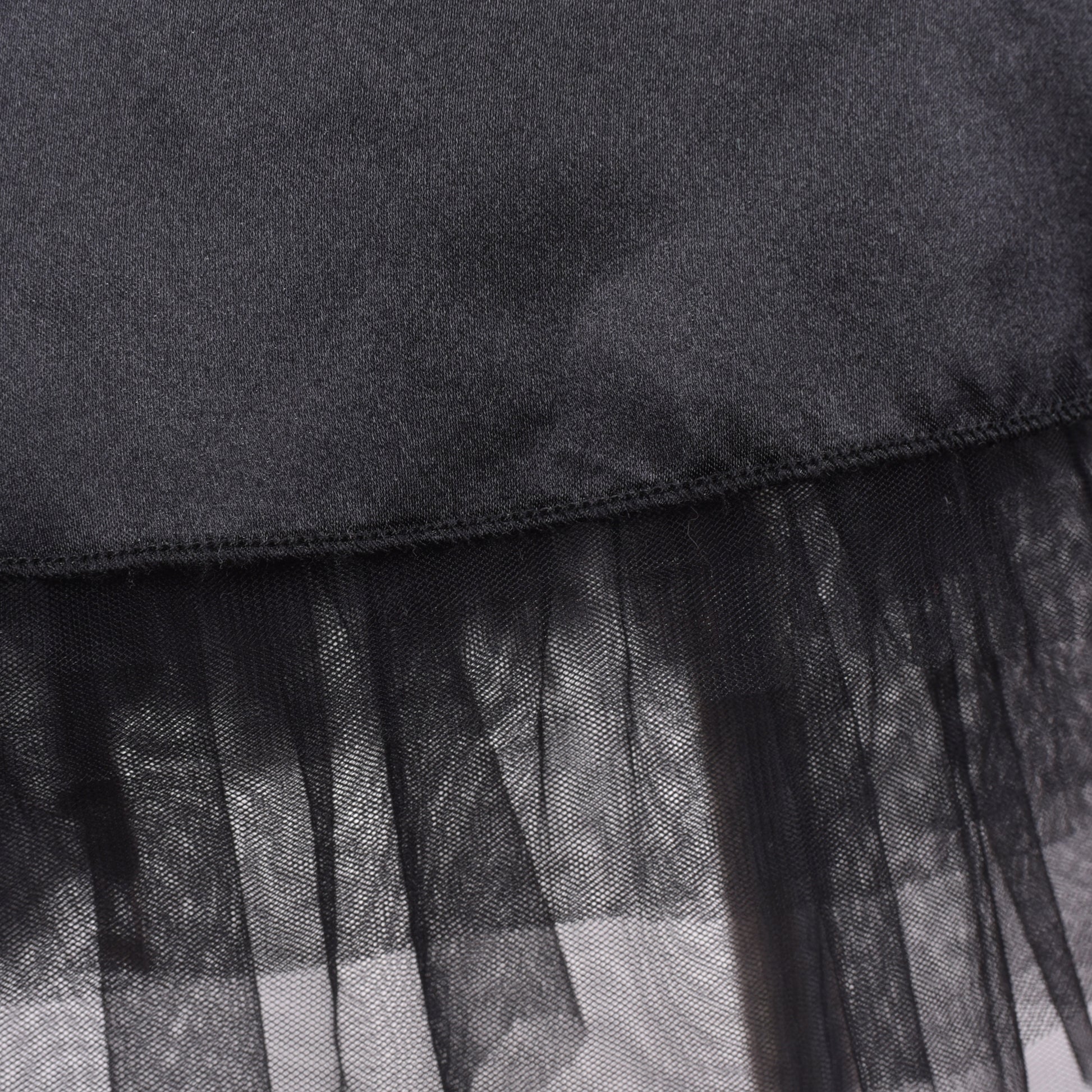 - Knee length. Hidden back zipper.Hi-low skirt.